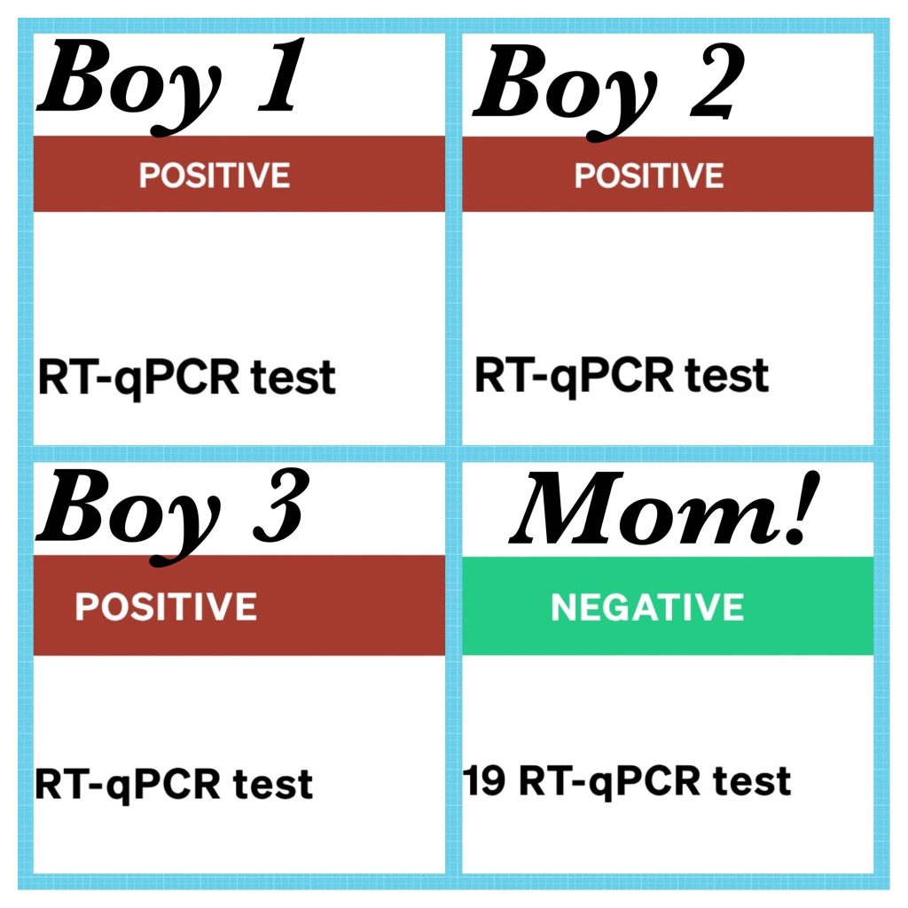 At 11:41 that Saturday night, I got an appointment for COVID testing for Super Tall Guy and The Little Guy and off we went to join hundreds of others in the parking lot of a vacant mall the next day. And then we started the waiting game for the results. Normally, this service kicked back results in 12 hours. This time, we waited through Monday, what should have been the boys’ first day back to school. We waited through Tuesday, through Mr. Ornery and I getting tested since he had started with symptoms and I figured I was DEFINITELY exposed to plenty of snot. And then the dreaded, but somehow expected, red bar showed up when the phone pinged me that the results were ready.