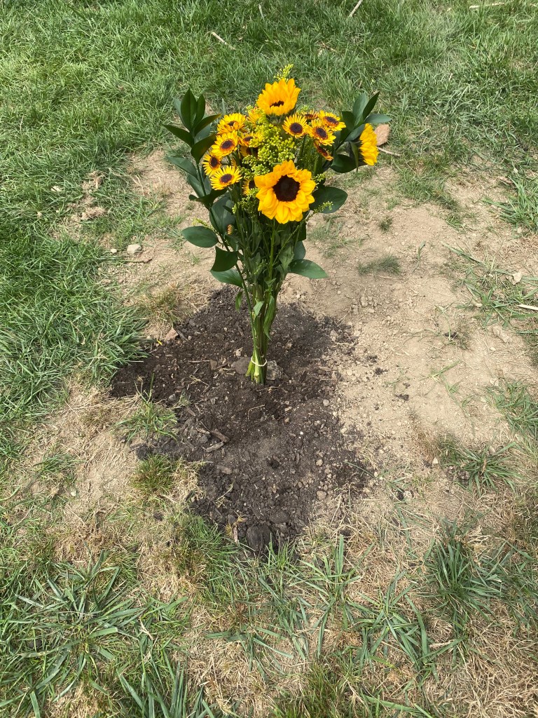 Back upstairs to work, just to be called down again for some school issue, but also the need to run to the local grocery store to buy flowers for the burial site. It was a bit for the 11-year-old to explain without many words the purpose of the flowers to the inquisitive cashier. But we stuck them in the ground (where they kept falling over and we decided they looked better that way anyway).